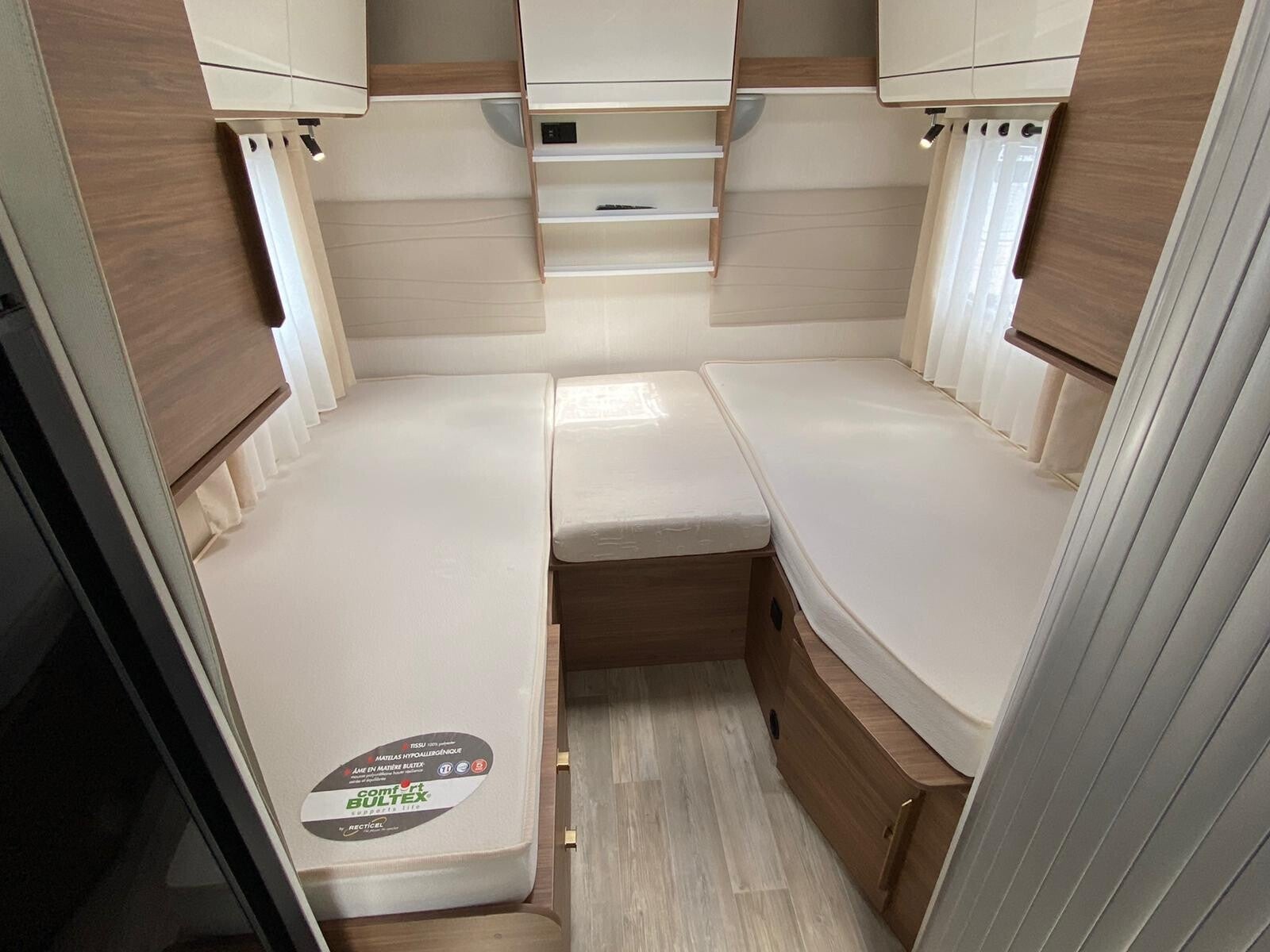 Deze 2 tot 3-persoonscamper is voorzien van vele gemakken, zoals warm/koud stromend water, douchecabine, toilet, ruime keuken met 2-pitsgasfornuis, spoelbak, koelkast met vriesvak en ruime opbergmogelijkheden.